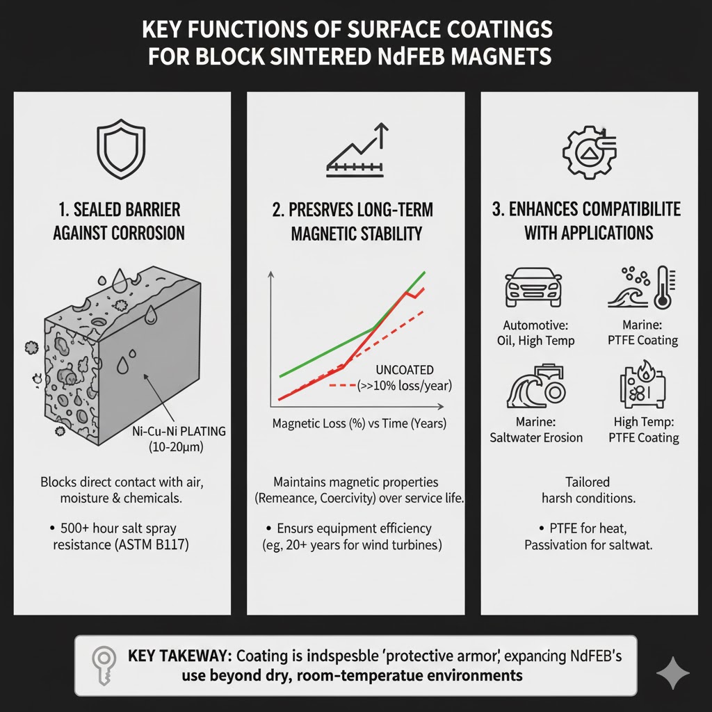 پوشش سطح به عنوان یک "زره محافظ" متناسب با آسیب پذیری های Block Sintered NdFeB عمل می کند و سه عملکرد اصلی را انجام می دهد که برای استفاده عملی آن ضروری است.