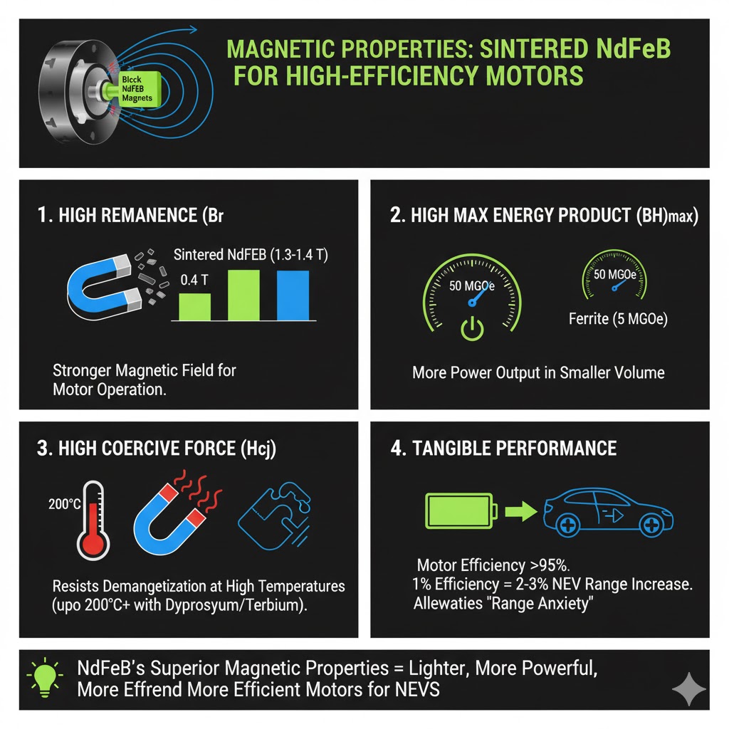 مزیت اصلی آهنرباهای NdFeB متخلخل از خواص مغناطیسی استثنایی آنها ناشی می شود که اساس موتورهای NEV با کارایی بالا را تشکیل می دهد. ساختار کریستالی چهارضلعی منحصربهفرد آنها که عمدتاً از نئودیمیم (25%-35%)، آهن (65%-75%) و بور (حدود 1%) تشکیل شدهاند، قابلیتهای مغناطیسی را به آنها میبخشد که بسیار فراتر از مواد سنتی است.